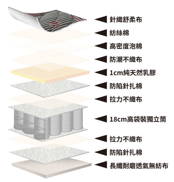 溫和親膚散、熱透氣、吸收人體重量均勻支撐,服貼人體各處曲線,躺得更舒服、睡得更安心。