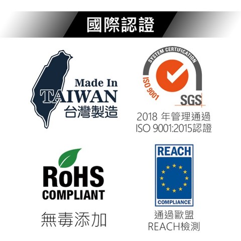 生產原料符合歐盟RoHS與REACH規範。通過SGS總檢驗8大類,223個毒物反應全項目符合標準!品質管理通過SGS ISO9001:2015認證,全程台灣製造,安全無虞。